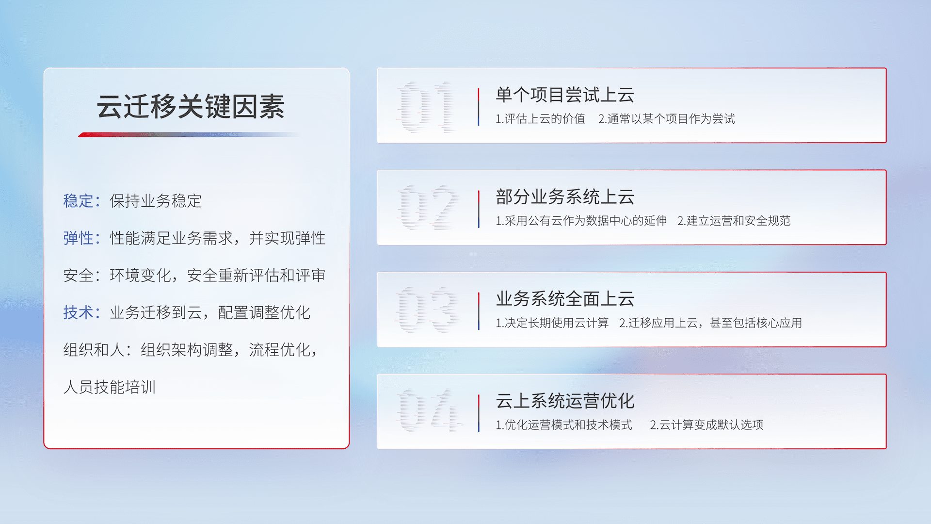 结合实际业务,,从规划设计、、、云平台选型、、、、云原生改造、、、、数据迁移、、、、集成交付,,迁移全过程为客户识别最佳上云路径,,做好风险识别管理,,,,设计网络架构、、身份权限、、、、安全审计合规、、操作审计、、日志审计、、、监控告警策略、、、多站点容灾设计等,,,对云上基础设施进行整体规划,,提升IT治理水平,,,以满足弹性、、、高可用、、高性能的需求。。。。