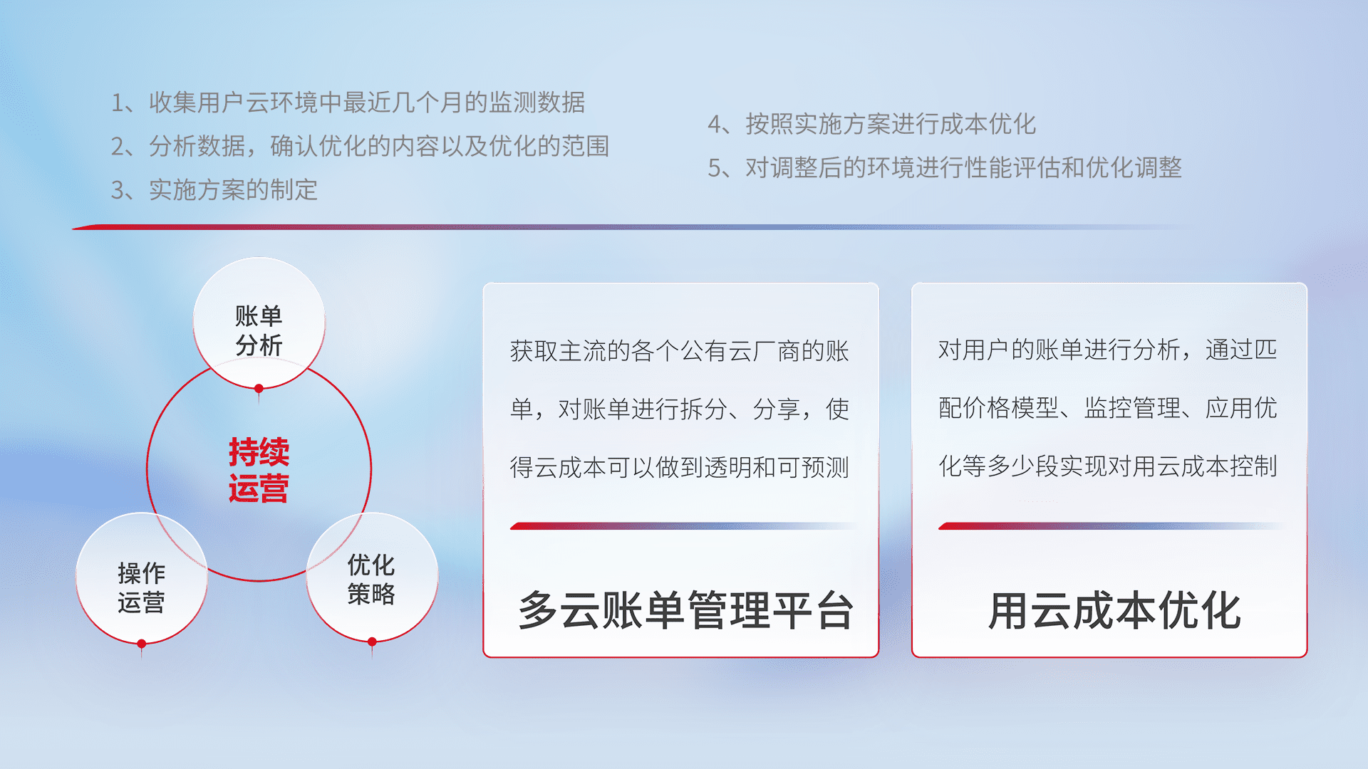 通过多云纳管,,,,以统一的资源数据模型把客户的云资源进行抽象和封装,,进而实现对多云资源的统一操作,,保障云资源管理的可靠性、、、稳定性与可用性。。量身定制化运维内容,,配置、、、开发运维、、补丁管理、、、备份、、、、监控、、认证和访问管理、、、、审计和日常巡检等,,保障在用云过程中的可靠度,,,稳定度以及高可用率。。